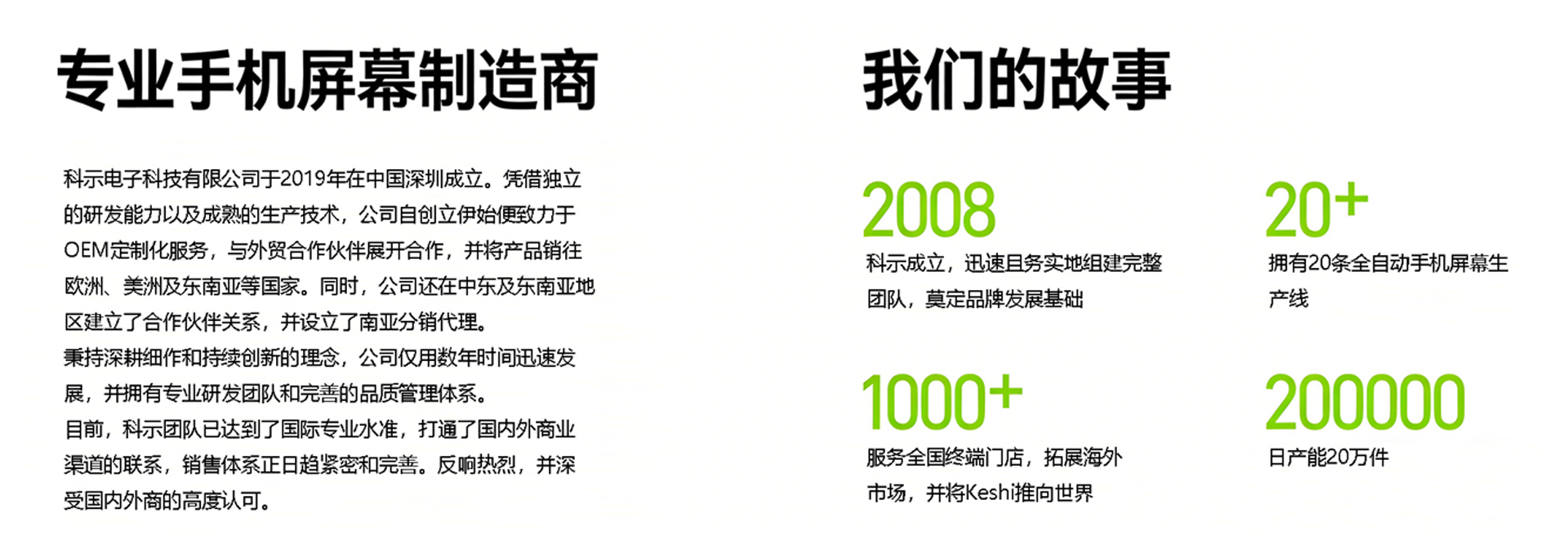 深圳科示电子科技有限公司自2019年于深圳成立以来,始终专注于手机液晶板块这一核心赛道。公司以“制造好屏幕,让显示更精彩”为愿景,构建起集自主设计、研发、精益制造以及秉持持续创新精神的发展体系。...